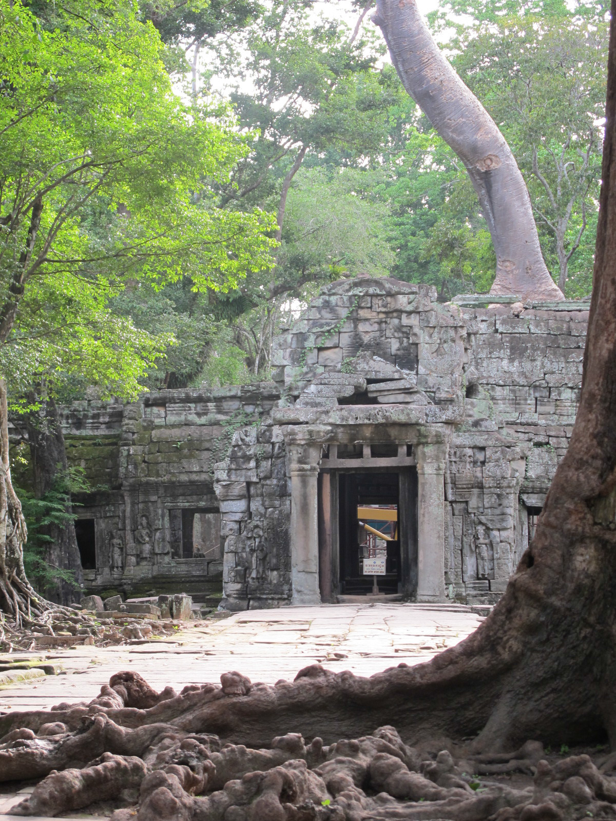 Tree roots sprawling on ground at back exit of Ta Prohm temple