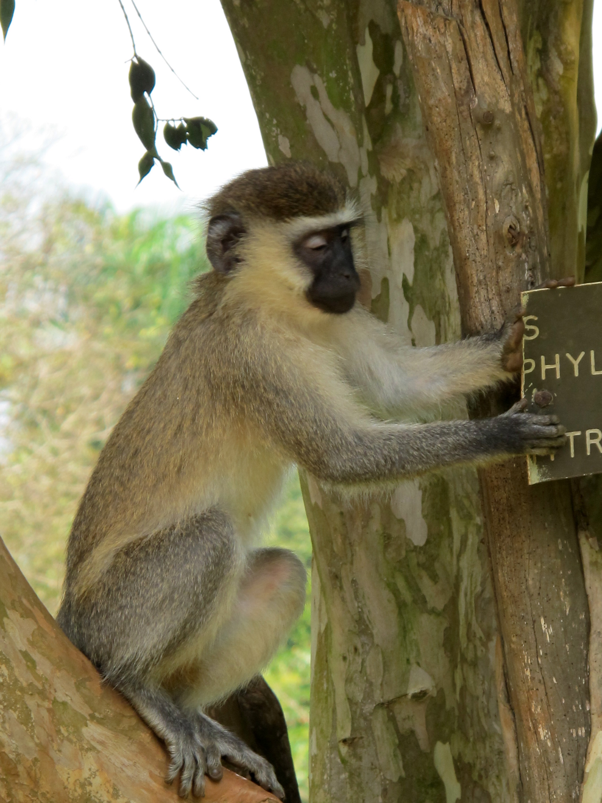 020There were also many monkeys clustered in groups roaming near us –the black and white colobus monkey with its black fur and long white mantle, and the vervet monkey with a black face and grey body hair. Both are native to Africa. We came across some berries that the locals use to color their lips red…an inexpensive lipstick! Among these berries I spotted a vine full of fiery red bird peppers.