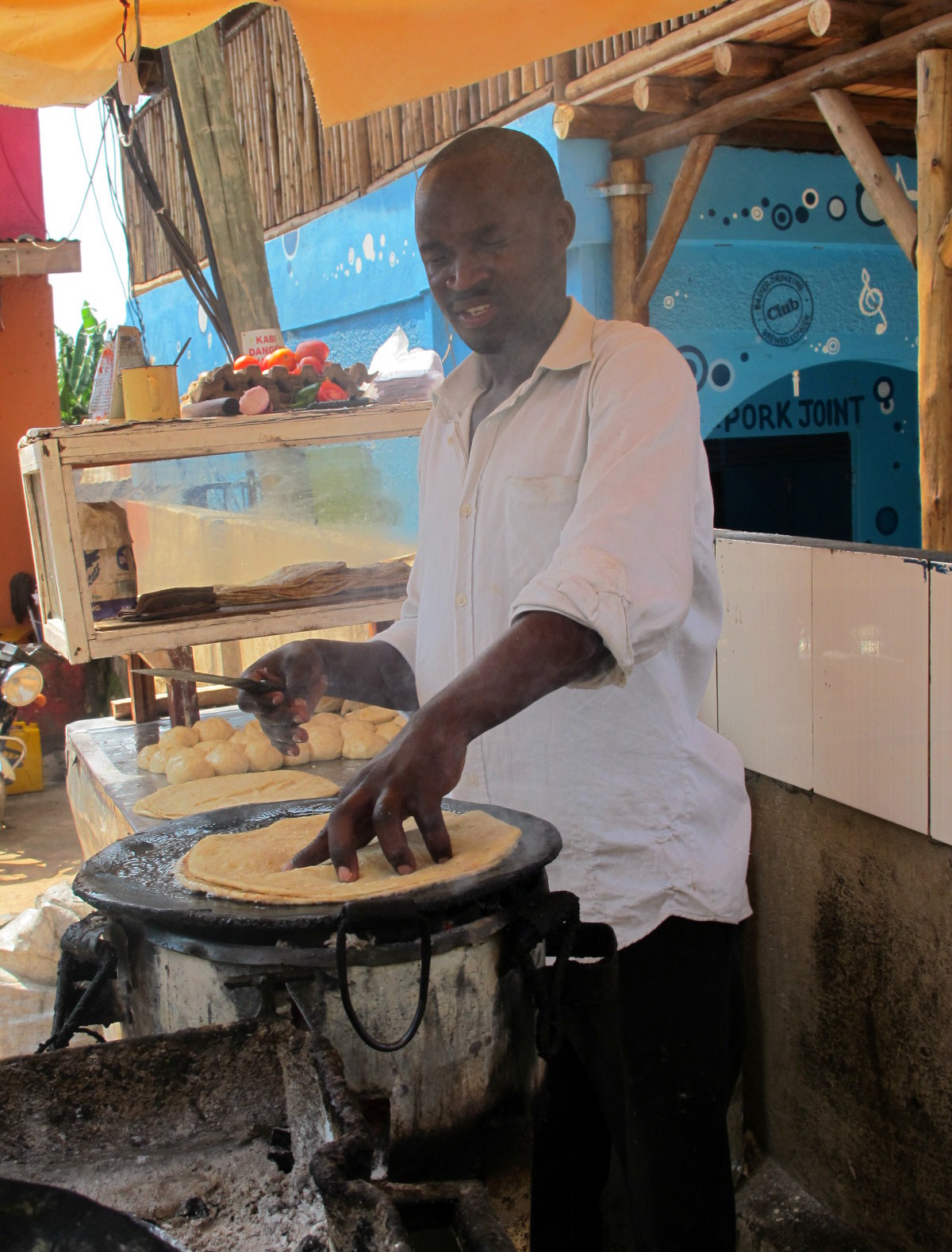 Next day after breakfast we walked towards the fun filled Kabalagala area again as it was close to my daughter’s home, to watch the people , see the shops and experience the chaotic traffic by walking. We walked by few vendors along the roadside preparing “Rolex”. A Swiss watch? No…but a chappati rolled with scrambled egg, and often with cabbage, onions and tomatoes. For a higher price, the vendor adds minced meat, and more vegetables. Then the chappati is rolled around a newspaper.1955aPopular all over Uganda, the Rolex was introduced in 2003 and became very popular, especially with students. It is an inexpensive meal for budget travelers as well. Ugandans call it their national snack without attributing the chappati to its Indian origins. Its name comes from the rolled omelet inside it.
