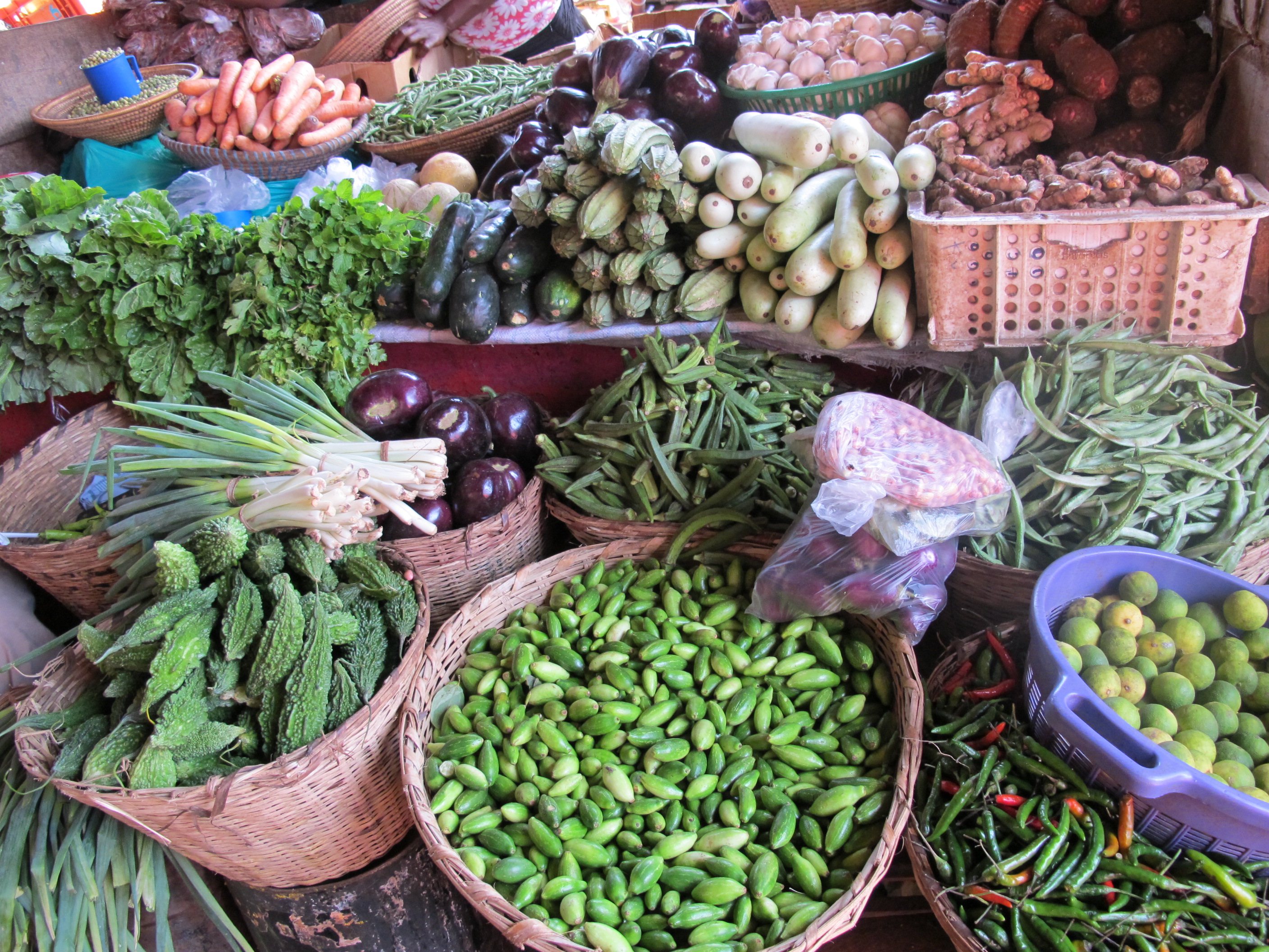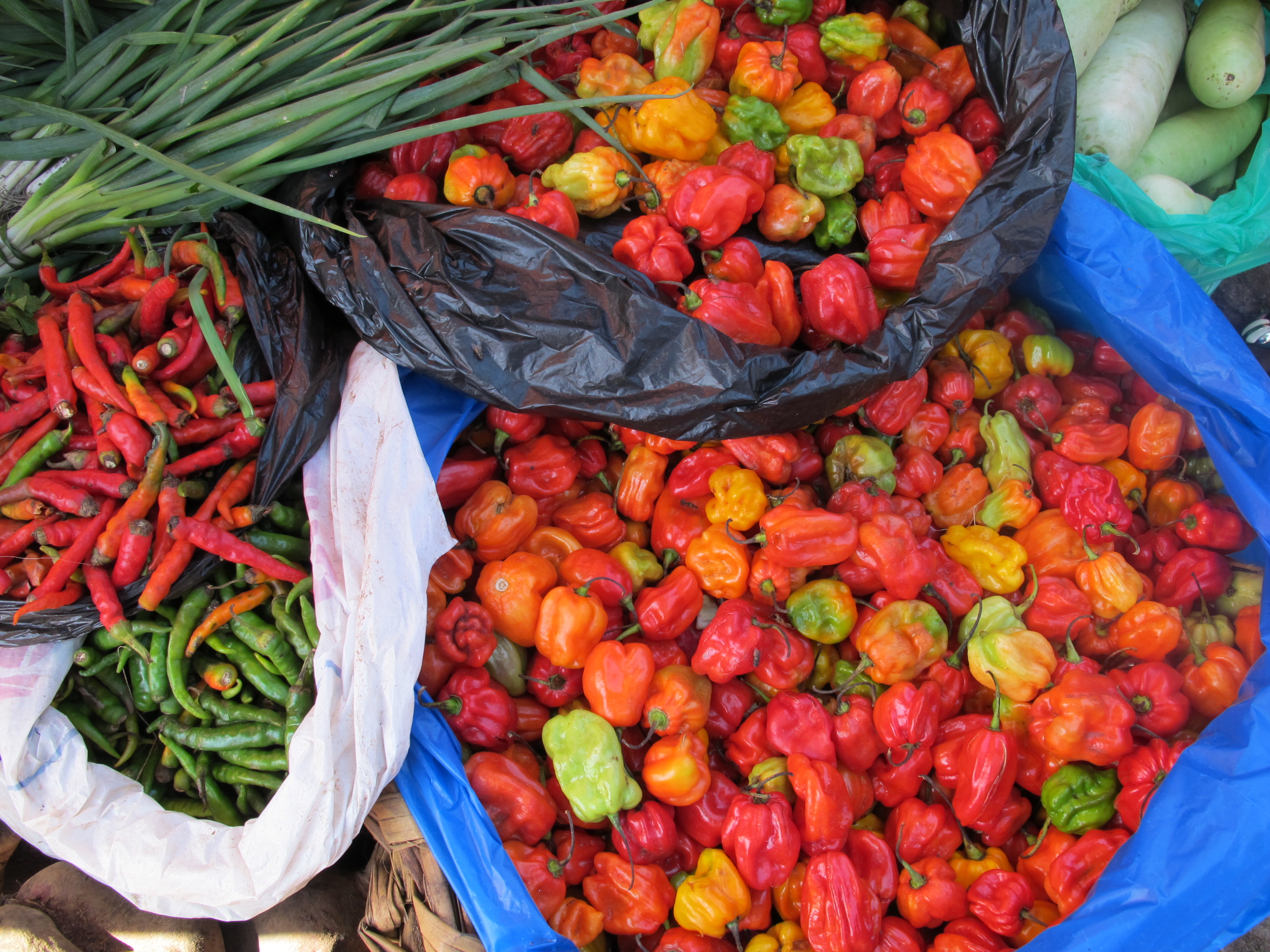 Indian name methi) and other herbs.  As a vendor was approaching me to buy his methi, I was shocked to see curry leaves in a basket! He said Indians come to him to buy his curry leaves and fenugreek leaves.304Then I saw a basket of green, yellow and orange habaneros! I didn’t realize locals ate these fiery peppers.