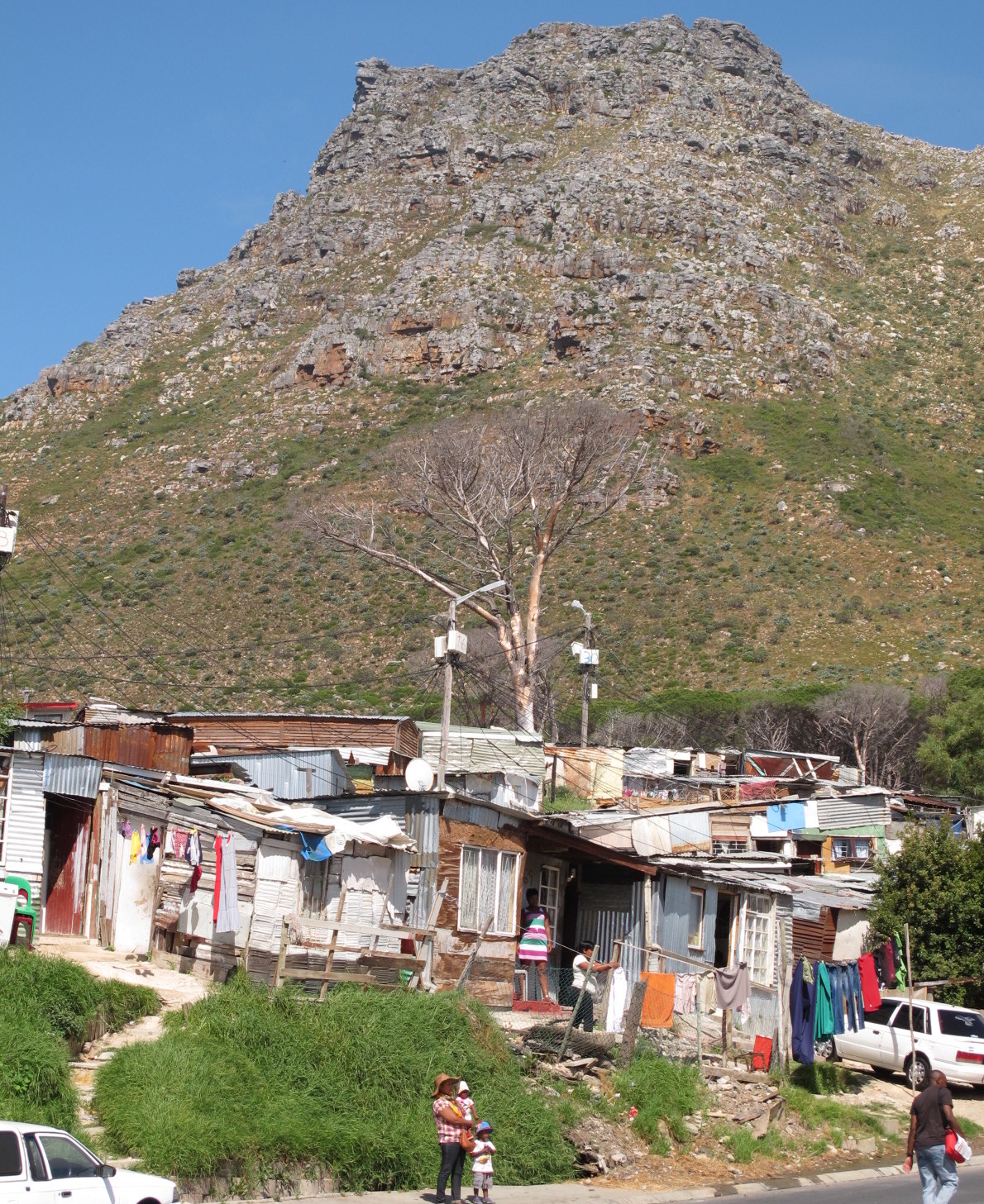 At Hout Bay, there are a few shantytowns, Black and Colored townships, flowing down the mountainside among the wealthy homes. In the afternoon we took a walking tour with a local guide through the closest Black township, ImiZamo Yethu, which is in the middle of Hout Bay. This township was first settled in 1980s by Xhosa settlers from the Eastern Cape when apartheid was dying. The place truly shocked me in this day and era after Apartheid. It was a tightly packed settlement with no running water, only 2 public dirty toilets for the whole community and open gutters with sewage flowing down and whose stench filled the air. It was difficult to watch the children playing around the gutters. Yet when we stopped at a shack to be greeted by a smiling owner, I was impressed to see a cozily decorated and clean place that clearly reflected the owner’s pride.