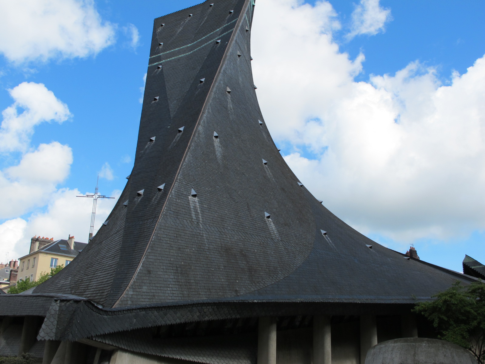 The St. Joan of Arc Church, built in 1979 (the building behind the cross) has a modern edge to it, symbolizing the flames that overtook Joan of Arc. It has a twisted style roof towards the center that is drawn into the sky….like a spaceship style structure. It was a surprise to see such a modern architecture surrounded by medieval buildings.