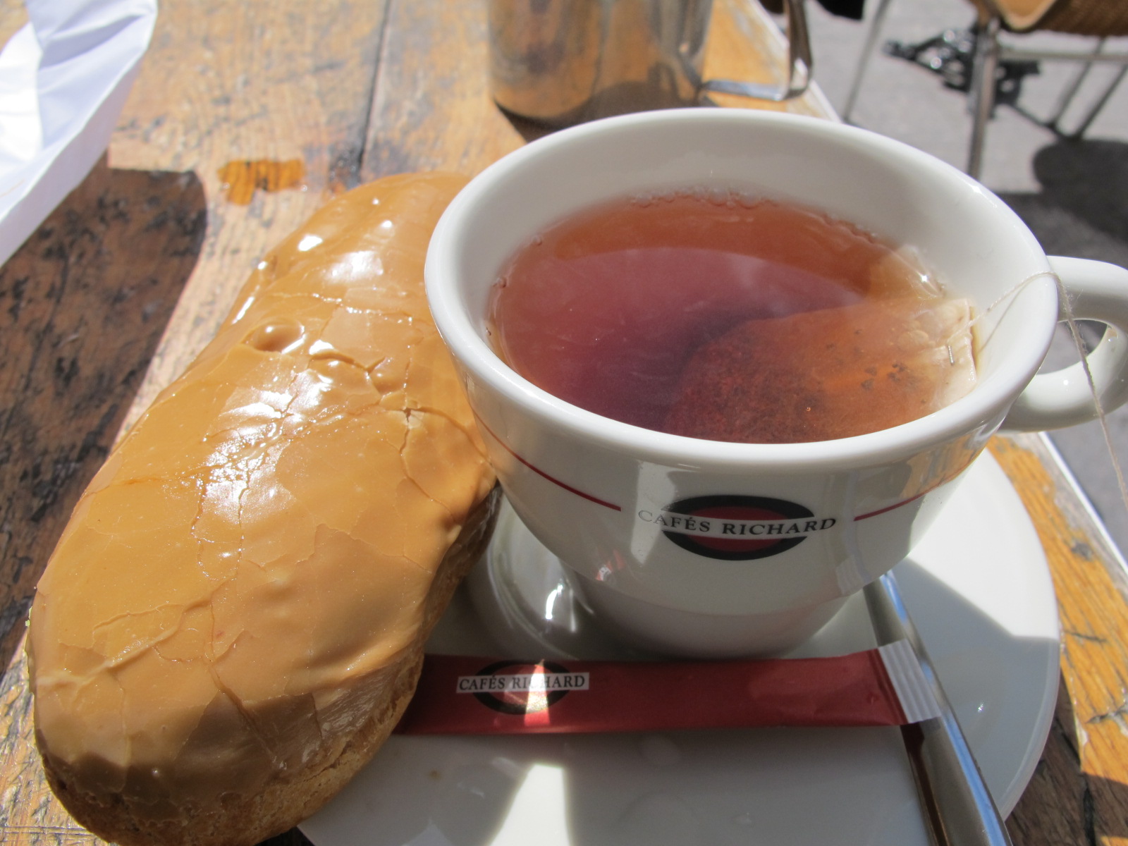 Then I walked further and found a lovely spot at an outdoor café to sit and finally enjoy some tea and my long desired chocolate éclair. It was heavenly… what I was waiting to do in France…enjoy an éclair…my first éclair! (mmmmm…. delicious, just as I remembered!)
