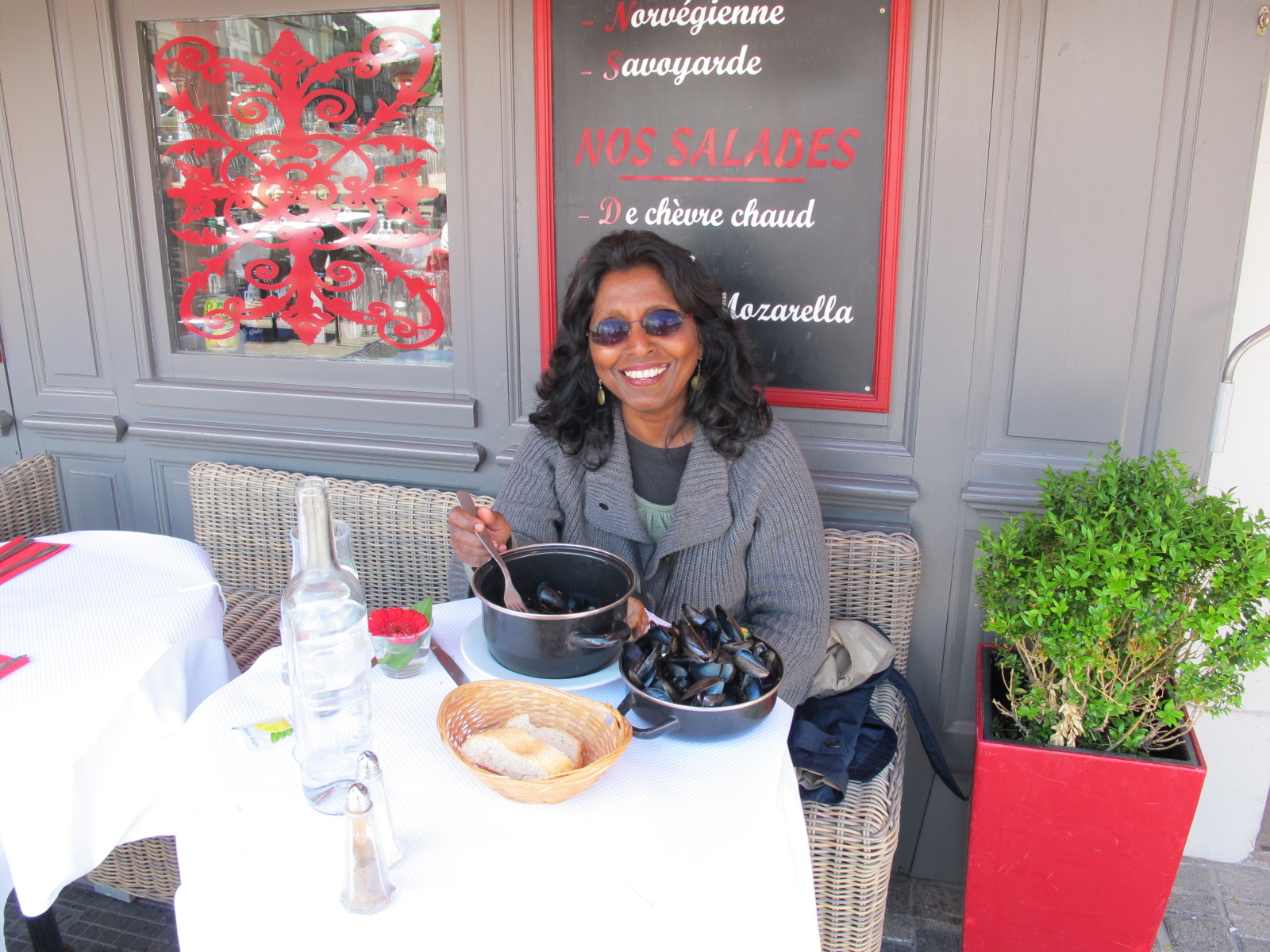 I normally don’t eat bread or butter served at restaurants in the US, but the bread there was so fresh and had a wonderfully addictive texture ….and the butter was so inviting! My neighbor was having moules au crème (mussels in a cream based sauce) and by looking at the smile on his lips I knew it must have been delicious too. As I was lifting the fork to eat the mussels, the friendly young waiter showed me how to eat the mussels the way locals do…using an empty clam shell to retrieve the inside of another. I savored the mussels and wine and enjoyed the view. And I mopped up the remaining sauce with the delicious bread. What a great lunch! I said to myself, “this is the first of many more to come!”