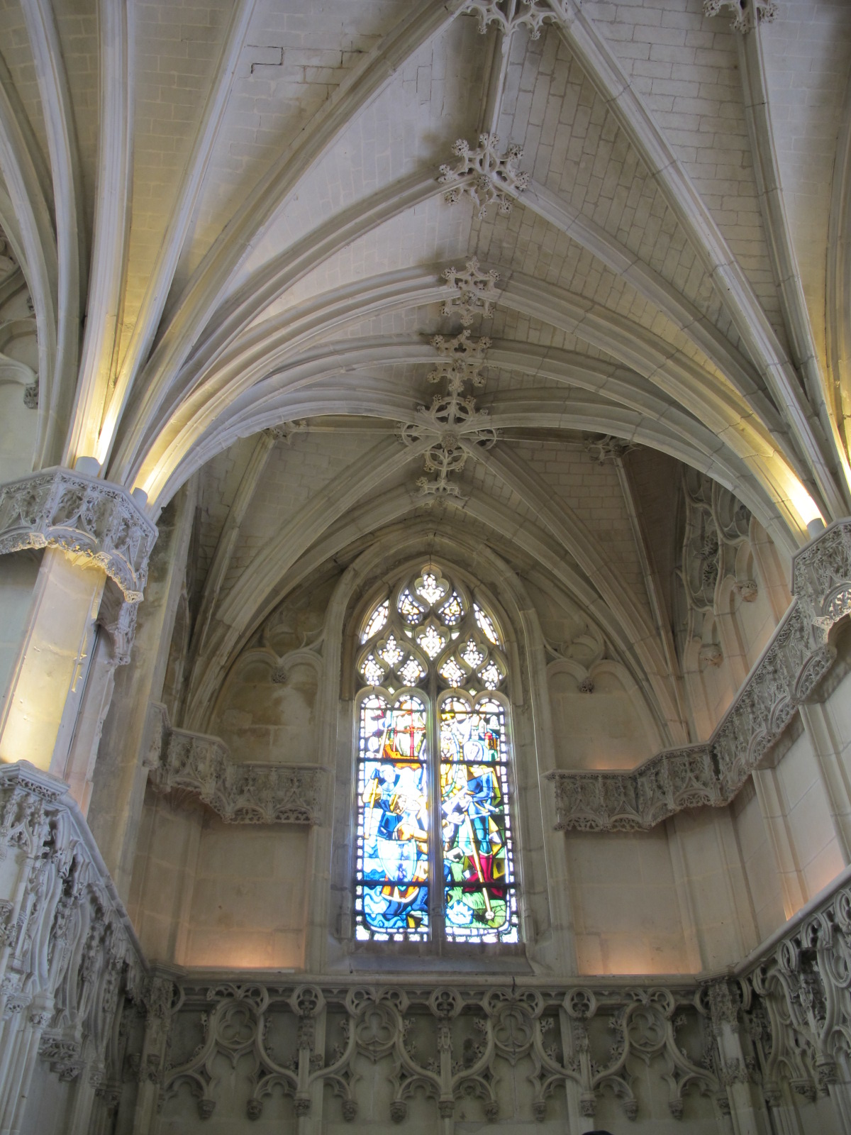 It has a beautiful architecture of Norman-Romanesque style with beautiful stained glass windows, and, as I walked inside, I was intrigued to see up on a pillar two small figurines, from the 12th century (referred to as the Bayeux lovers), a couple in embrace that symbolized fidelity.